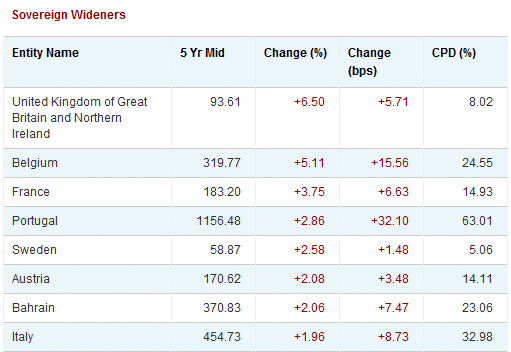 First, in the sovereign space, the UK was the biggest widener on the day, but the default probability is only 8%. I don’t see this as anything to note. On the other hand, if you look at the numbers for Belgium, and France and Austria to a degree, the default probabilities are getting worrisome. When thinking about sovereign contagion, those are the three countries to think about..."