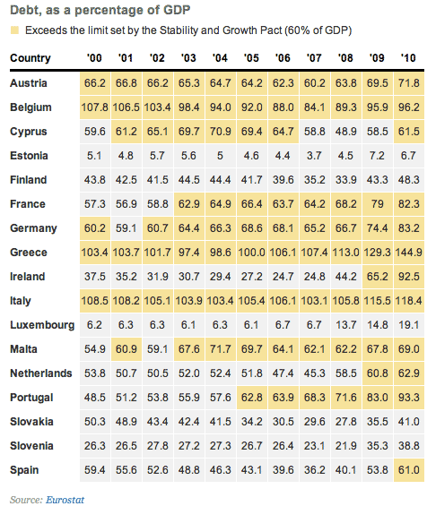 "Here are two interesting charts courtesy of the Macro Business Superblog. In outlining how the latest European crisis response policy fails to deal with the underlying issues in Euroland, Macro Business also illuminated the individual debt and deficit trajectory of each euro nation. The charts highlight where the euro area countries have broken the Maastricht stability and growth pact criteria.